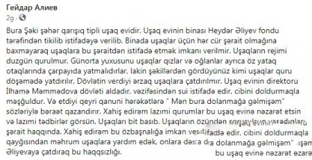 capar.info: - "Bura Şəki şəhər qarışıq tipli uşaq evidir. Uşaq evinin binası Heydər Əliyev fondu tərəfindən tikilib istifadəyə verilib. Binada uşaqlar üçün hər cür şərait olmağına baxmayaraq uşaqlara bu şəraitdən istifadə etmək imkanı verilmir". DİA.AZ bildirir ki, bunu Heydər Əliyev adlı istifadəçi "Müştərinin Səsi" sosial qrupundakı paylaşımında qeyd edir.