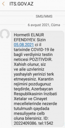 Peyvənddən bir neçə gün sonra vəziyyəti pisləşən Elnur Əfəndiyev həkimə müraciət edib, test verib və koronavirusa yoluxduğu bəlli olub. Dediyinə görə, avqustun 6-dan müalicə alır, lakin hələ də vəziyyəti ağır olaraq qalır: