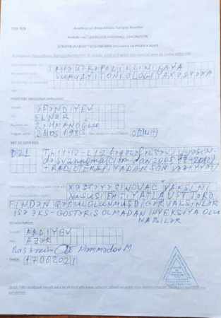Elnur Əfəndiyev Meydan TV-yə danışıb ki, peyvənd könüllü olsa da, hər yerdə sertifikat tələb edilir. Buna görə də məcburiyyət qarşısında xəstəxanaya müraciət edib: “İranda həkimlər vitaminlər, o cümlədən immunitet üçün dərmanlardan istifadə etməməyimi, əks halda xəstəliyin yenidən yarana biləcəyini demişdilər. Çoxlu sayda şüa almışam və bunu təsdiq edən sənədi də xəstəxanada baş həkimə təqdim etdim”.