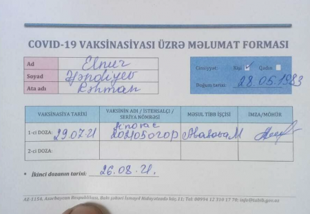 Elnur Əfəndiyevə koronavirusa yoluxduğundan peyvəndin ikinci dozası vurulmayacaq. Birinci dozanı alsa da, peyvənd olunmuş kimi qeydiyyata alınmır, sertifikat verilməyəcək. Şikayətçi peyvəndlə xəstəliyinin yenidən baş qaldıracağından narahatdır: