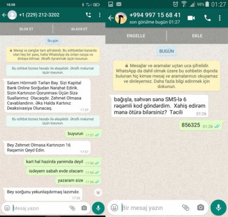 “+994550002212 nömrəsindən zəng edərək özlərini Kapital Bankın təhlükəsizlik xidmətinin əməkdaşları kimi təqdim etdilər. Məndən hesabımdakı pulu sığortalamaq adıyla bütün informasiyaları aldılar. Sanki hipnoz edilmişdim. Dəfələrlə belə hadisələr barədə eşitsəm. də, buna baxmayaraaq belə bir “onlayn tələ”yə düşdüm. Hələ də şokdayam. Dərhal 196 çağrı mərkəzinə və 102-yə zəng vurdum. Lakin artıq gec idi və 3000 AZN hesabımdan çıxılmışdı”.